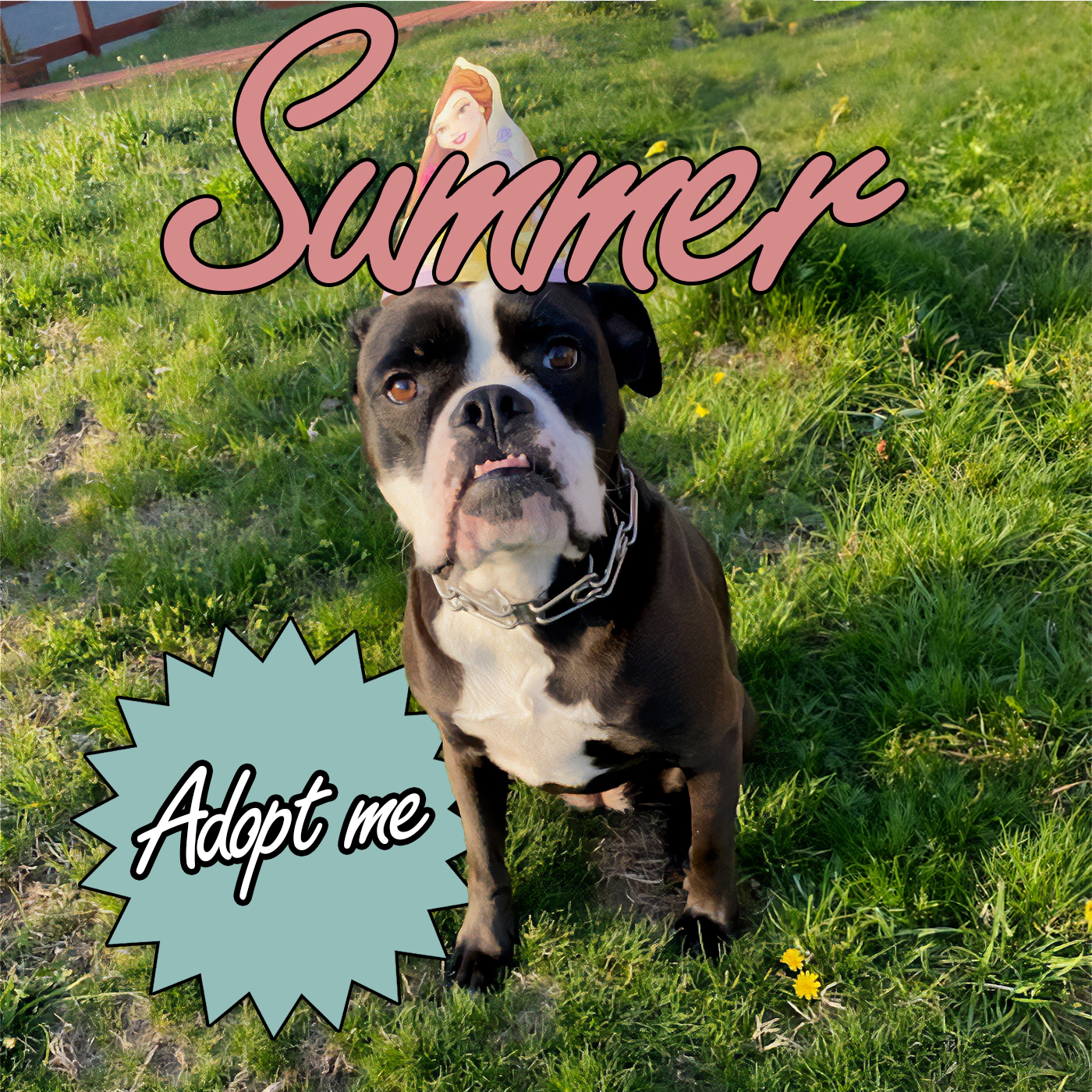 This sweet 8-year-old English Bulldog needs a home. She must be an only dog but is great with children. Summer is housetrained, spayed, up-to-date on shots, and healthy. She’s 55 lbs, tall and lean, and has over 4 years of formal training.