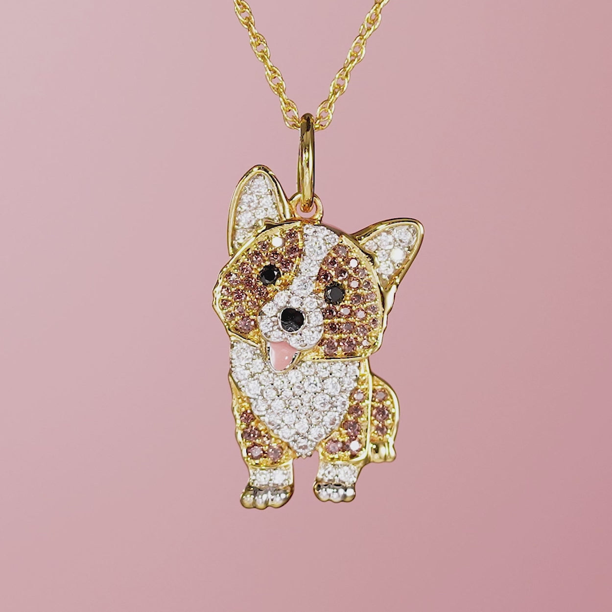 This darling 18K Yellow Gold plated Sterling Silver necklace on an 18K Yellow Gold plated Sterling Silver 18” rope chain features a Corgi puppy pendant. Bred to herd cattle, the Corgi is known for being fearless, independent and protective, but with loved ones this puppy is loyal, affectionate, and playful.