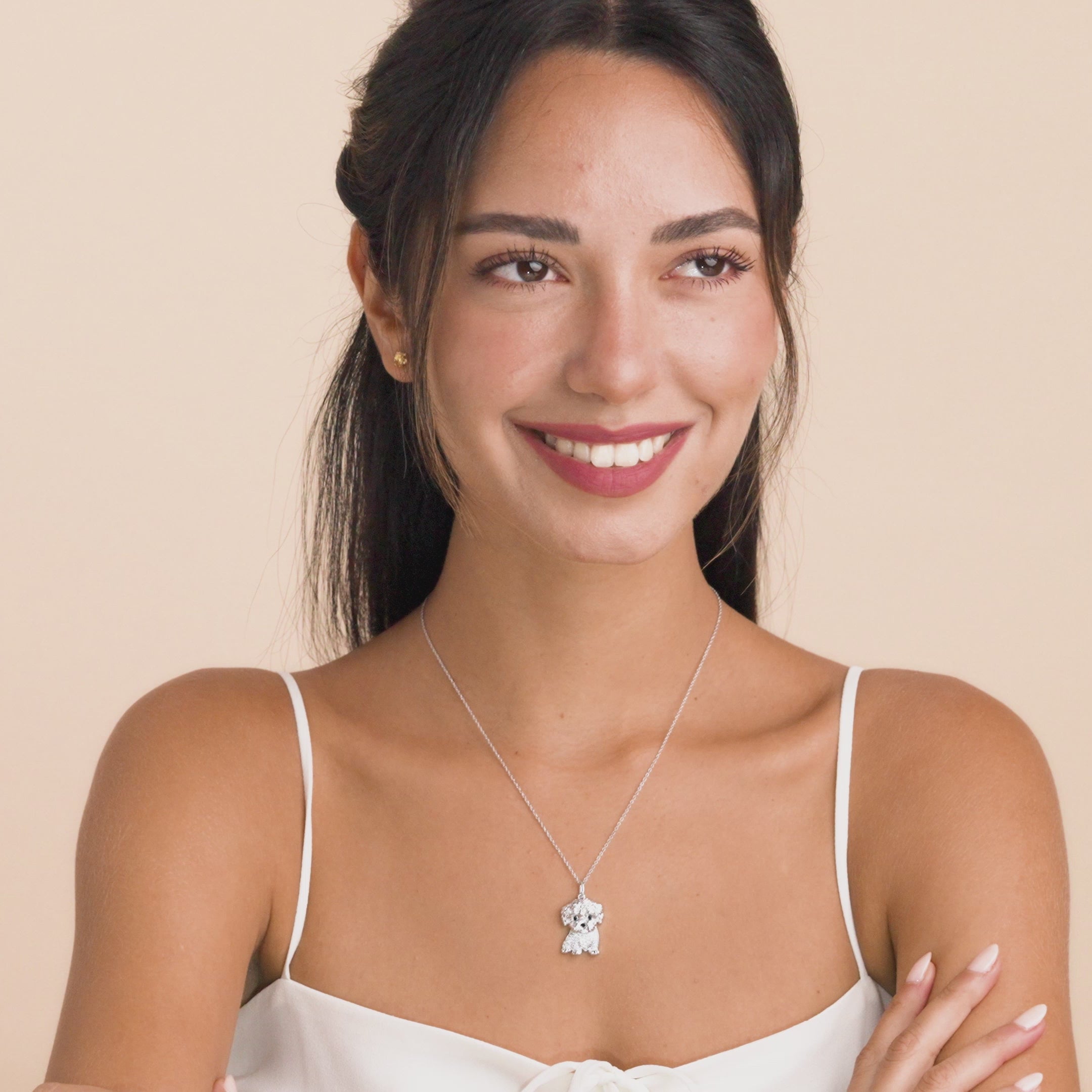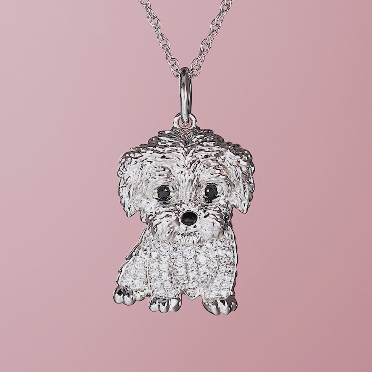This lovely Rhodium plated Sterling Silver necklace on an 18” rope chain features a Maltese puppy pendant. Tiny, sprightly, and elegant, with a long, silky, white coat, the Maltese remains a symbol of luxury.
